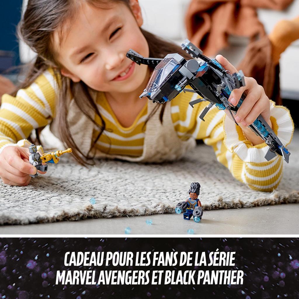 Lance-toi dans la bataille avec le dragon volant de Black Panther. Oriente les 4 ailes articulées vers l’avant, l’arrière, le haut ou le bas pour réaliser des manœuvres audacieuses à pleine vitesse. Attention au fusil blaster du guerrier Chitauri ! Réplique en tirant avec tes fusils à tenons. Relève le cockpit pour changer de pilote (Black Panther ou sa sœur, Shuri) puis élance-toi à nouveau dans le ciel à bord de l’avion de combat numéro 1 de Wakanda.