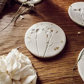 Façonnez des disques plats à décorer avec des empreintes, dessins, initiales ou paillettes. Laissez sécher puis vernissez.