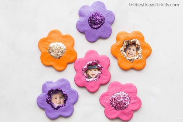 Modelez des formes simples comme des cœurs ou des étoiles en pâte à sel. Collez ensuite des perles en bois pour créer des porte-photos originaux.