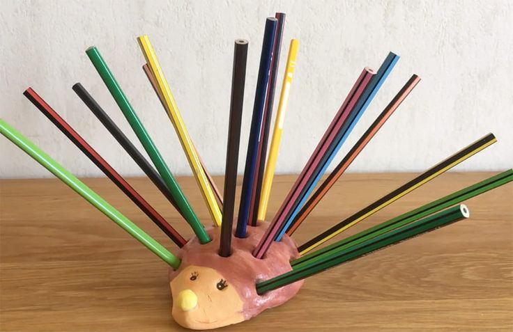 Formez un ovale pour le corps du hérisson, en pointant légèrement vers l’avant. Créez une petite boule pour le nez et placez la à l’extrémité pointue. Utilisez la pointe d’un stylo pour faire les yeux et appuyez plus fort pour créer les trous. Une fois la pâte cuite, il ne vous reste plus qu’à ajouter des crayons pour créer les piquants.