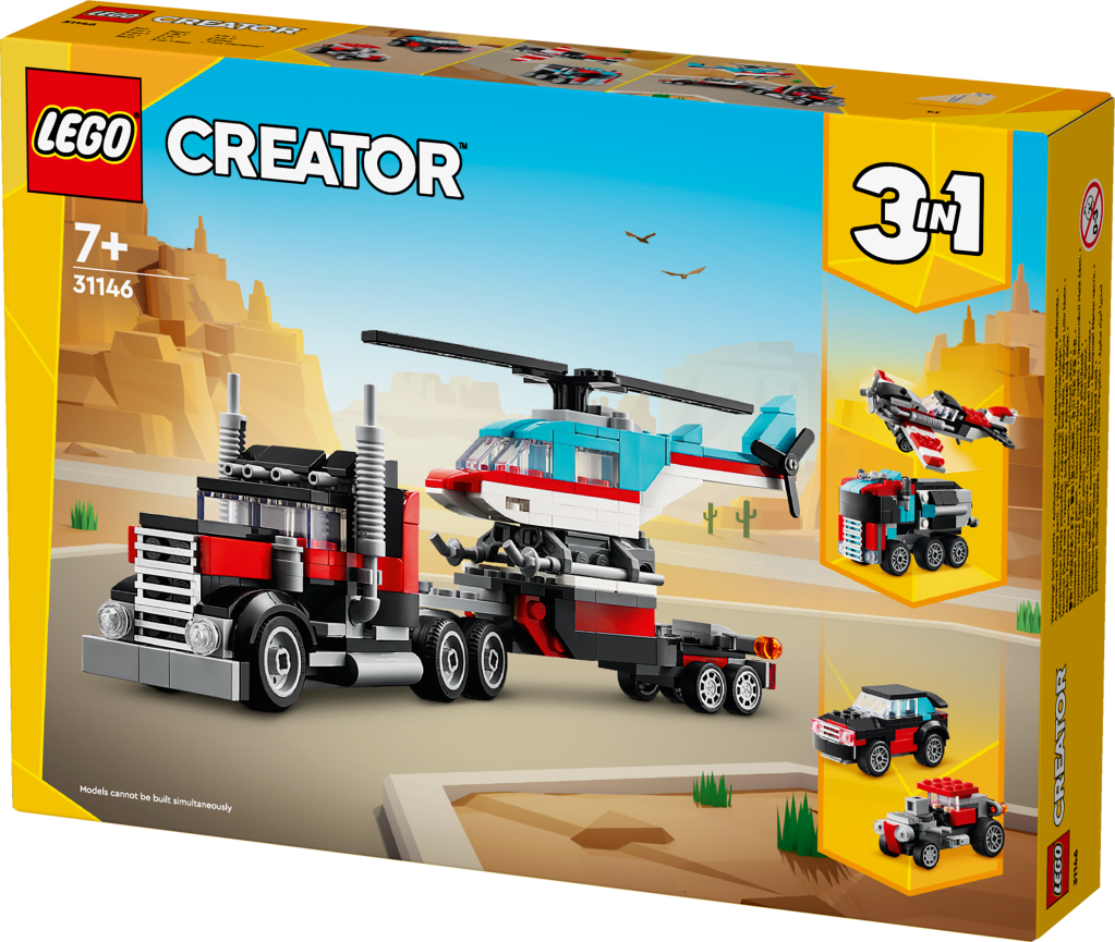 Ce set 3-en-1 camion-remorque vous réserve des surprises. Il permet de construire un camion-remorque avec hélicoptère, mais aussi de le transformer en 2 autres sets :