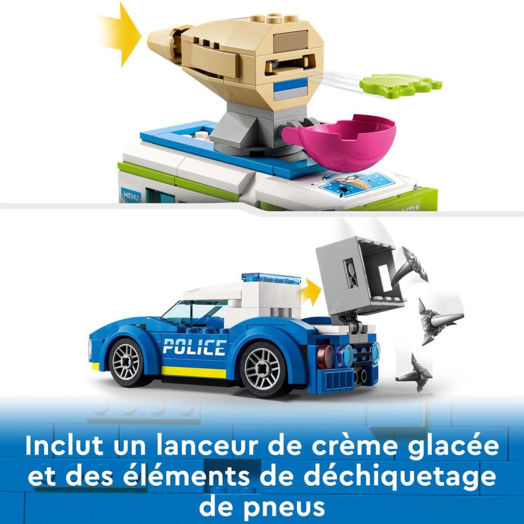 Scratch ! Deux affreux criminels ont arraché un distributeur de billets et s’enfuient à bord de leur camion de glaces personnalisé ! Mobilise la policière de LEGO® City dans la fabuleuse voiture d’intervention ! Évite la glace lancée par le lance-glace du camion et déploie les déchiqueteurs de pneus pour immobiliser les voleurs ! Tu t’apprêtes à vivre des aventures « glaçantes » à LEGO City !