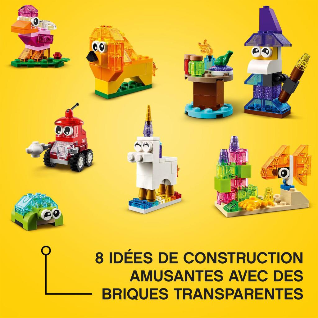 Apportez une touche de brillance aux créations LEGO® de vos enfants avec ce set LEGO® Classic Briques transparentes créatives, qui contient un ensemble coloré de pièces LEGO transparentes. Les enfants peuvent choisir de construire l’un des 8 modèles étincelants proposés, comme le sorcier avec ses flacons de potion ou le robot brillant qui sert du thé. Par ailleurs, avec les briques supplémentaires fournies dans la boîte, les enfants peuvent créer tout ce qui leur passe par la tête et développer des compétences essentielles tandis qu’ils construisent et jouent.