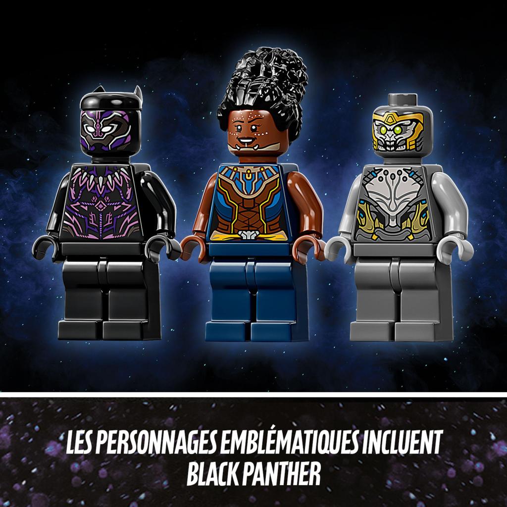 Lance-toi dans la bataille avec le dragon volant de Black Panther. Oriente les 4 ailes articulées vers l’avant, l’arrière, le haut ou le bas pour réaliser des manœuvres audacieuses à pleine vitesse. Attention au fusil blaster du guerrier Chitauri ! Réplique en tirant avec tes fusils à tenons. Relève le cockpit pour changer de pilote (Black Panther ou sa sœur, Shuri) puis élance-toi à nouveau dans le ciel à bord de l’avion de combat numéro 1 de Wakanda.