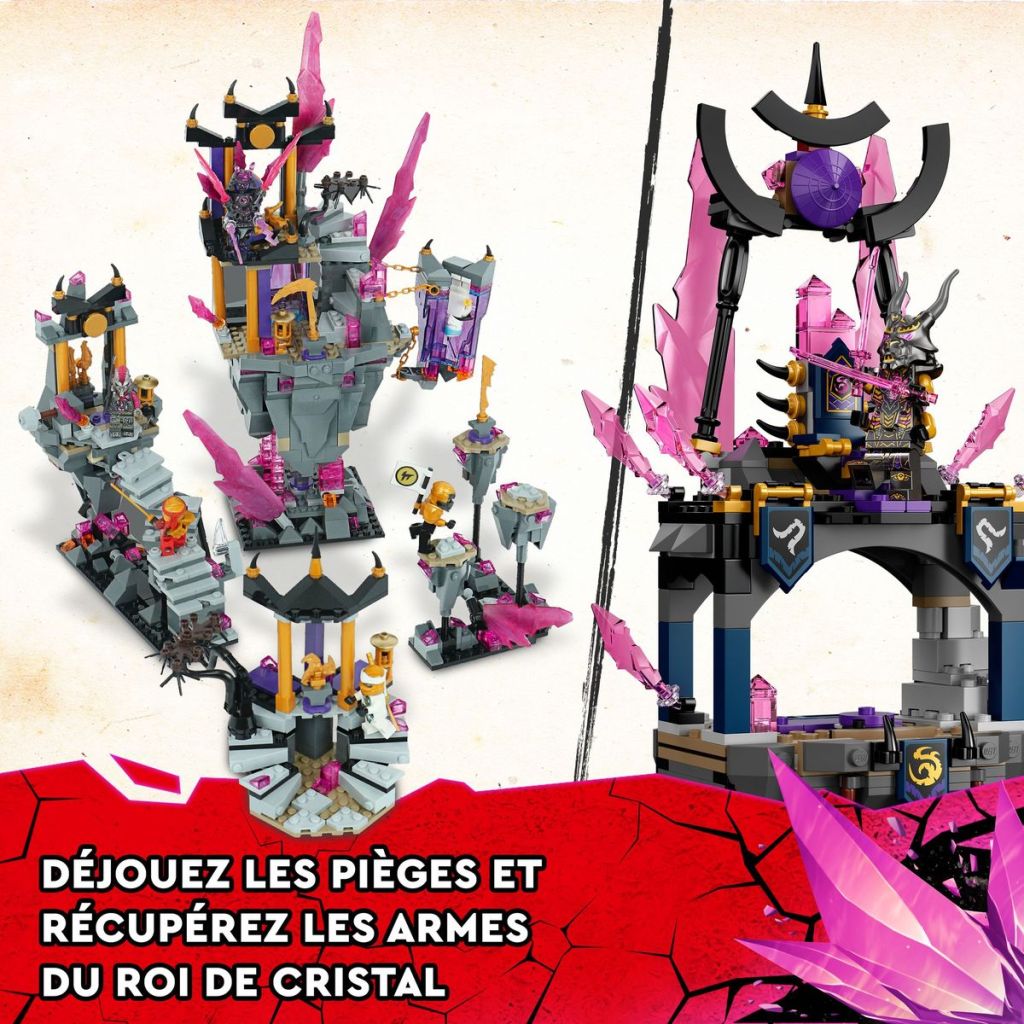 Grimpe en haut du temple pour récupérer les armes élémentaires volées aux ninjas. Mais attention… le temple est truffé de pièges dangereux pour t’arrêter dans ta quête ! Tu dois les franchir et t’emparer des armes au nez et à la barbe du Roi de cristal avant de remporter la bataille finale sur le Roi et son Garde de pierre venge. Toi seul(e) peux contrecarrer leur plan et les empêcher de mettre la main sur NINJAGO® City !