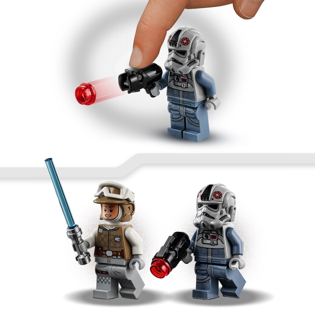 Prépare-toi à passer à l’action sur la planète glacée de Hoth avec ces incroyables Microfighters AT-AT et Tauntaun. Grimpe sur la selle du Tauntaun avec Luke Skywalker et cherche l’ennemi avec ses électrojumelles. Passe à l’attaque avec le sabre laser et le fusil à tenons de Luke, mais attention au fusil à tenons du pilote de l’AT-AT. Qui remportera la bataille ? L’Empire galactique ou l’Alliance rebelle ? À toi de décider !