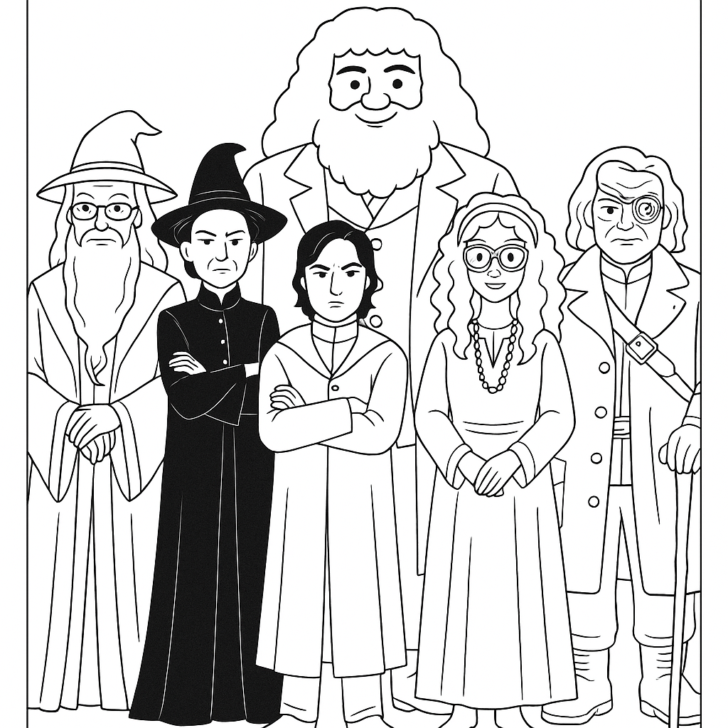 Les figures magistrales de Poudlard méritent une attention particulière dans leur représentation. La longue barbe argentée de Dumbledore s’illumine grâce à des dégradés de gris perle et blanc nacré. La cape noire caractéristique du professeur Rogue prend du relief avec des nuances de noir profond et d’anthracite.